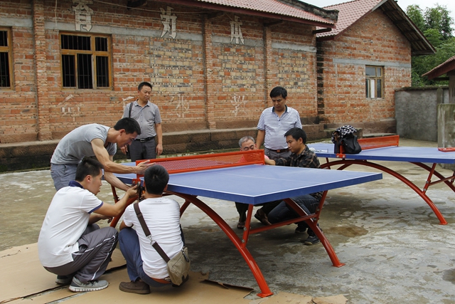 部分代表同教师们合力安装体育设施